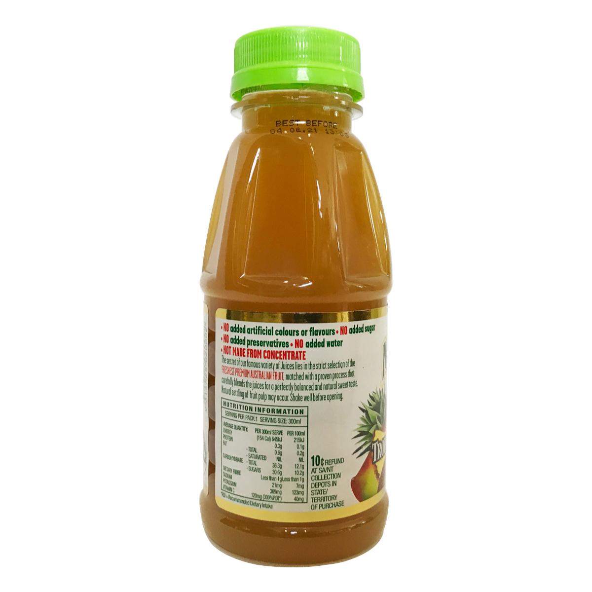 - Thành phần: 100% Nước ép từ những trái cây tươi cao cấp nhất của Úc được ép bằng công nghệ ép lạnh với công nghệ đóng chai tự động. (34% nước ép Lê, 30% nước ép Táo, 30% nước ép dứa, 5% xoài xay nhuyễn, 1% nước ép chanh dây).